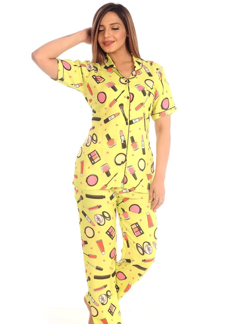 Wear your passions with my collection of lifestyle-themed prints. This bright yellow set, covered in makeup essentials, is perfect for beauty lovers. It's a fun way to express your personality, even when you're just relaxing at home.
