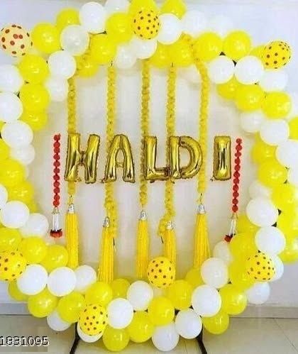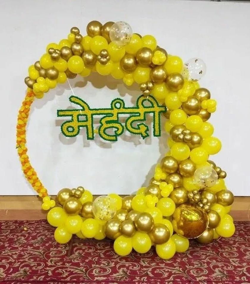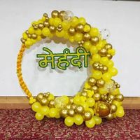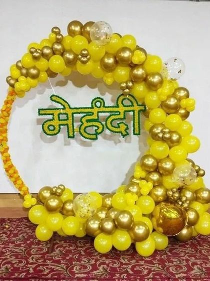For pre-wedding functions like Haldi and Mehendi, I create vibrant backdrops using traditional yellow and orange themes. These setups feature balloon arches and drapes, perfect for your ceremony photos.