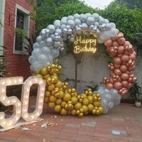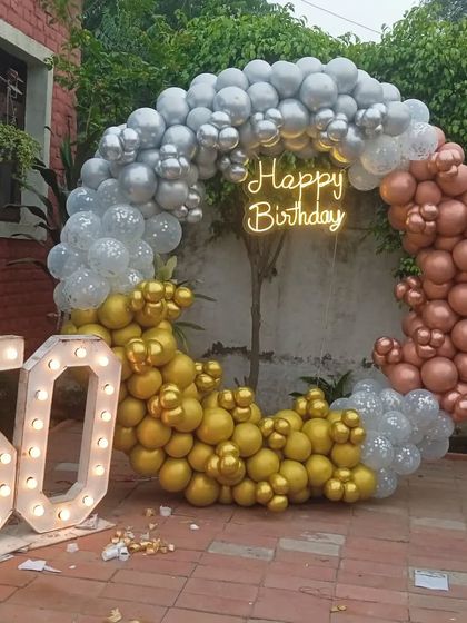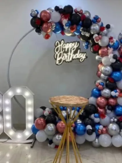 I provide complete decoration for milestone birthdays and anniversaries, from the 1st to the 50th and beyond. My service includes balloon arches, shimmer backdrops for photos, large light-up marquee numbers, and custom neon signs.