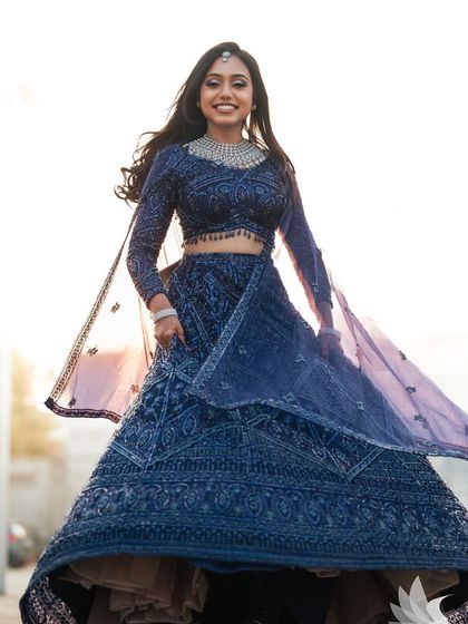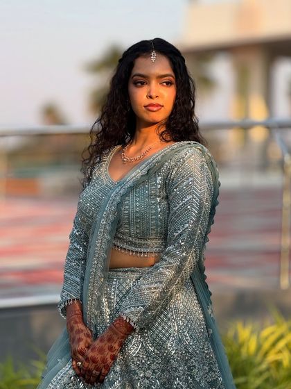 Modern open heat-styling (Hollywood waves, textured curls) or messy buns. Draping and pinning for heavy Lehengas, Gowns, or Indo-western outfits (includes can-can management).