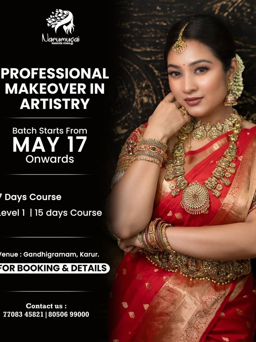 My academy offers hands-on courses for all skill levels, from a 7-day foundation program to a 15-day advanced certification. You will learn everything from skin prep and product selection to specialized techniques like HD bridal makeup, airbrushing, and professional hairstyling in my Karur studio or through online classes.