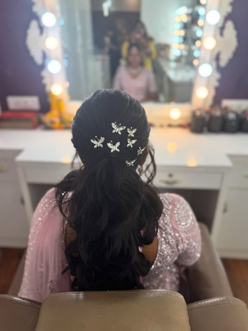 A complete bridal look includes perfect hair and nails. I create a variety of hairstyles, from intricate traditional braids adorned with mallipu and jadai to modern, romantic updos and waves for receptions, and also offer professional nail art services.