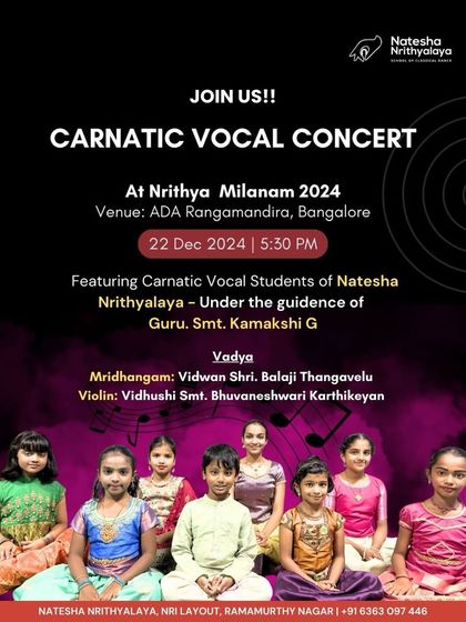 We teach Bharatanatyam and Carnatic vocal to all ages with focus on strong basics, real stage performance, and a supportive community, including exam and university prep if needed.