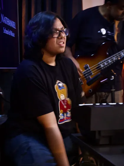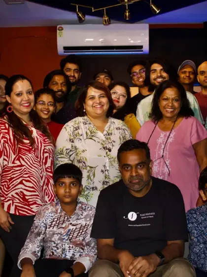 Hey, we’re Nathaniel School of Music. Started out 17 years back, and now, look at us – 6,000+ students, some bringing their kids too! My mom Lillian’s here, coaching voices and sharing her wisdom. We’re not about making robots who just read notes. Our thing? Full-on musicianship. From Beatles to Nusrat, we get into the real stuff: theory, ear training, jamming, lots of ‘aha’ moments. Whether you’re at our Bangalore studio or online, it’s always a musical family vibe.