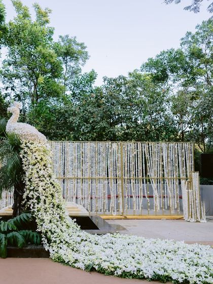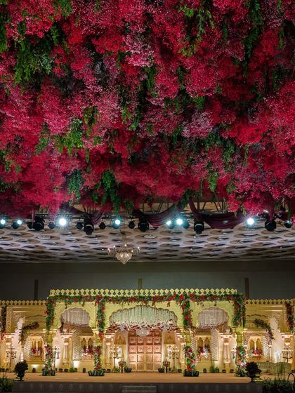 This is the emotional core. I focus on personalized mandap design—whether you want something regal and traditional, or modern and minimal. Grand entryways, flower tunnels, even glass aisles with blooms beneath your feet. Signature touch? Dense floral canopies and crystal chandeliers everywhere.