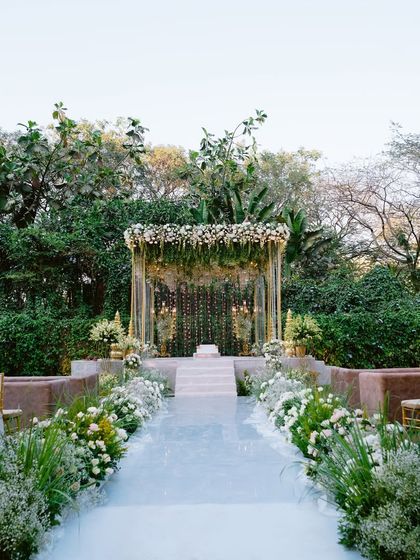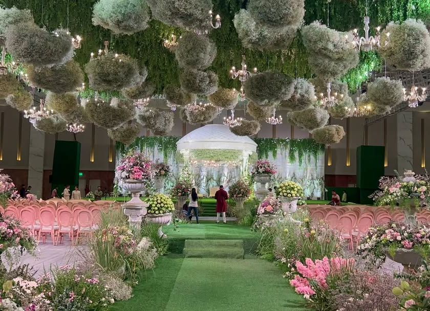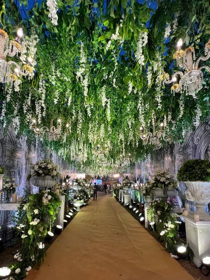 I design serene and elegant atmospheres using a classic palette of whites and lush greens. Perfect for everything from a tranquil Haldi to a sophisticated beachside wedding or a grand reception, these designs feature elements like baby's breath canopies, floral arches, and botanical installations for a timeless, natural aesthetic.