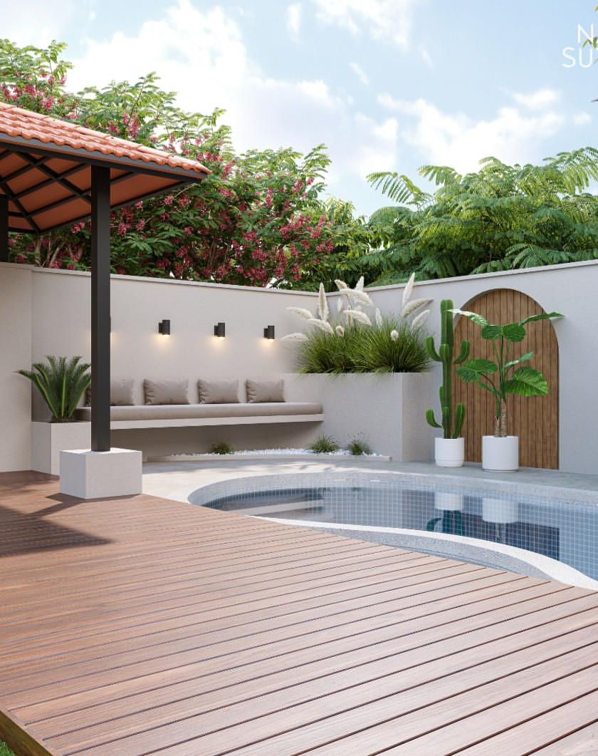 We design poolside areas that function as personal resorts, blending relaxation and utility. Our designs feature elements like durable wooden decks for lounging, shaded gazebos for conversations, and unique features like custom mosaic walls or serene water fountains.
