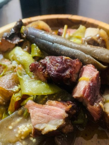 Pork is a favorite in Naga cuisine, and I cook it in many ways. You can try my special smoked pork with axone, simple pork curry with bamboo shoot, or adventurous dishes like pork innards and trotters.