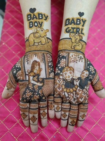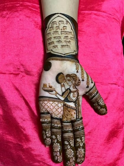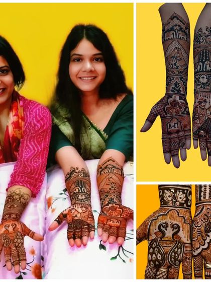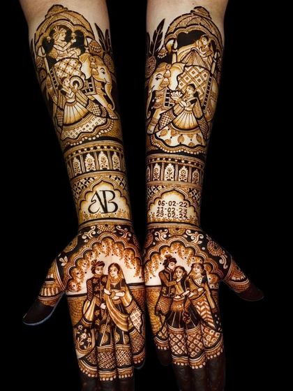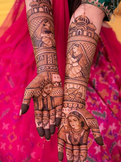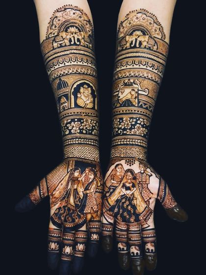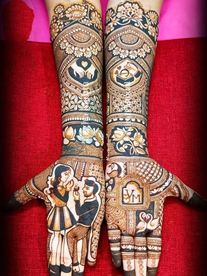 I design bridal mehndi with custom portraits, wedding scenes, and motifs, covering hands to elbows and feet to calves, using detailed Rajasthani and other styles as per your story.