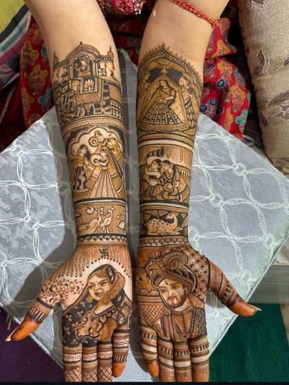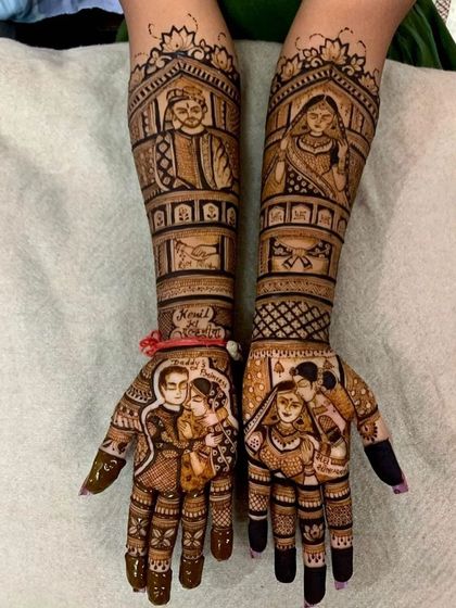 I specialize in creating highly detailed portrait designs in mehndi - a unique art form that captures likenesses of people, pets, or significant symbols in henna. Each design requires precision and advanced artistic skills to translate photographs into intricate mehndi patterns.
