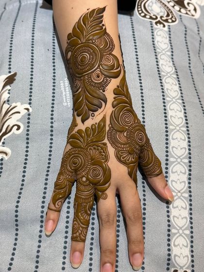 For clients who love a modern and striking look, I offer Gulf and Dubai-style henna. These designs are defined by their bold floral and geometric shapes, prominent use of shading for a 3D effect, and artful use of negative space.