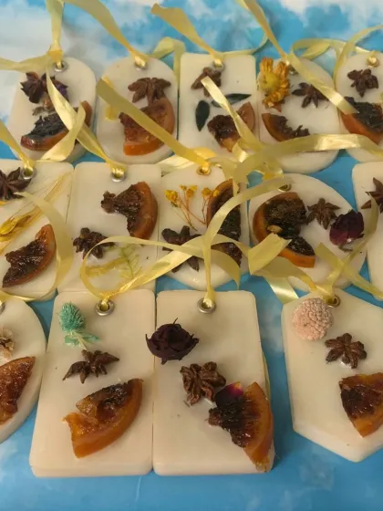 - My soy wax sachets are decorated by hand with dried flowers and fruits. You can hang them in your closet or tuck them in drawers for a gentle, long-lasting scent.