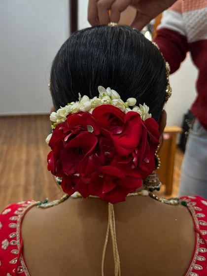 - Add-ons: Includes hair padding, stuffing for volume, crimping, and setting of real flowers (flowers arranged by client).