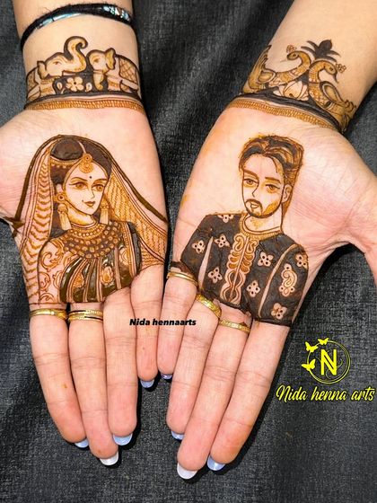 I create custom bridal mehandi with couple portraits, personal motifs, and full hand and feet coverage, designed from scratch for each bride.