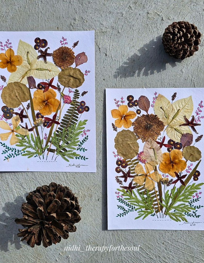 This is a special kind of art where I preserve memories from my travels. I collect and press flowers and leaves from places like Bali, Chikamagaluru, and Delhi, then arrange them into unique botanical collages. Each piece is a one-of-a-kind artwork that brings the beauty of nature indoors.