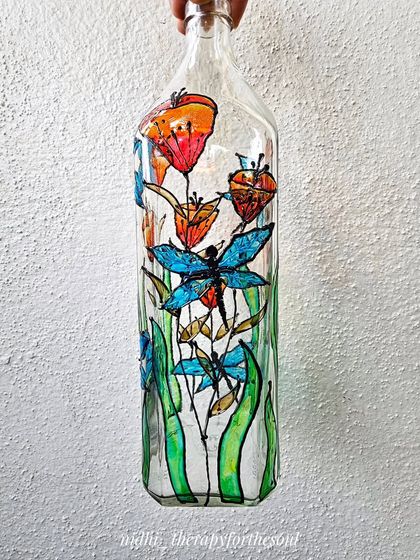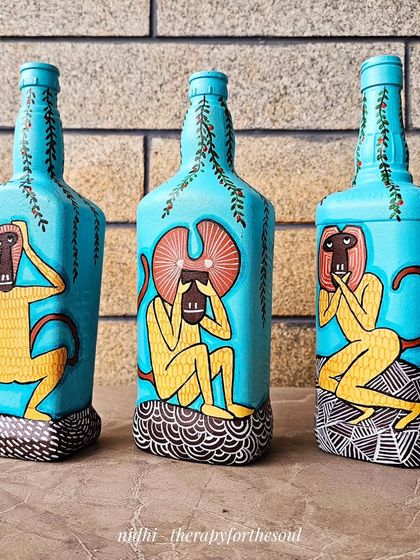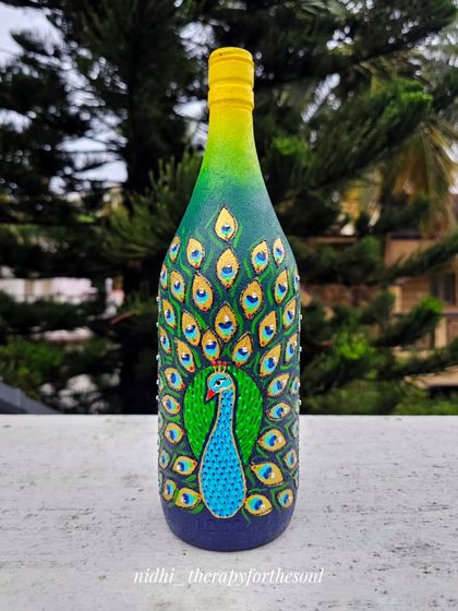 I love turning everyday things into art, especially old glass bottles. They start out as 'kabaad' (junk) and end up as upcycled bottle art, painted with peacocks, monkeys, desert scenes - whatever catches my fancy. Sometimes I use glass paints for a stained-glass effect - think butterflies floating in sunlight, or fish shimmering under water.