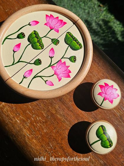 Furniture knobs and handles? I hand-paint those as well. The Pichwai-inspired ones with pink lotuses can totally change the vibe of a boring cabinet. I’ve done wooden knobs, lamp chimneys, festive candle holders, mandala hangings, and traditional Indian wall plates (Warli is a favorite).