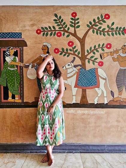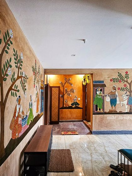 I create large-scale wall murals that blend traditional Indian art styles like Cheriyal and Pichwai with contemporary elements. Each mural is meticulously hand-painted, incorporating intricate patterns, cultural motifs, and nature-inspired themes.