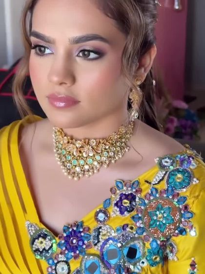 Mehendi and Haldi ceremonies are all about color, fun, and celebration. I design playful and fresh makeup looks that complement vibrant outfits, from sunny yellows to lush greens. Hairstyles are often relaxed, like messy ponytails or soft waves with floral accessories, perfect for a joyful daytime event.