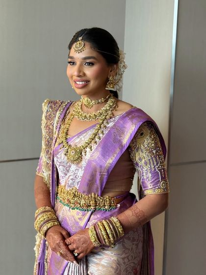 I have a special love for creating looks for my South Indian brides. I focus on complementing the rich Kanchipuram sarees and traditional temple jewelry with makeup that is both timeless and radiant. From classic braided hairstyles with fresh flowers to elegant updos, every detail is perfected.
