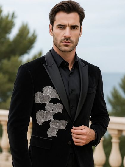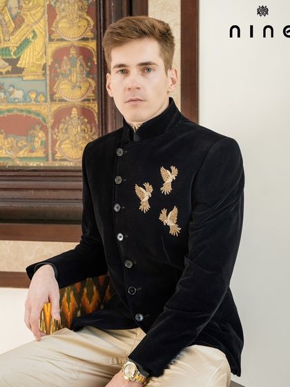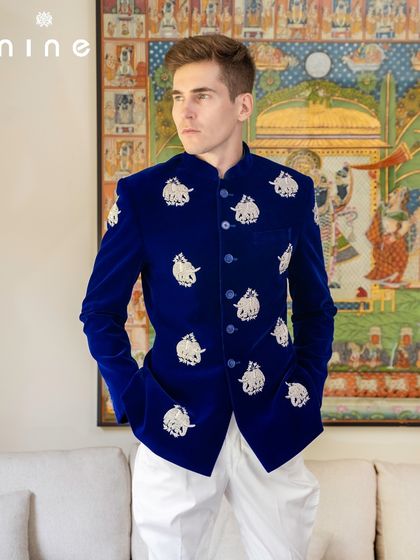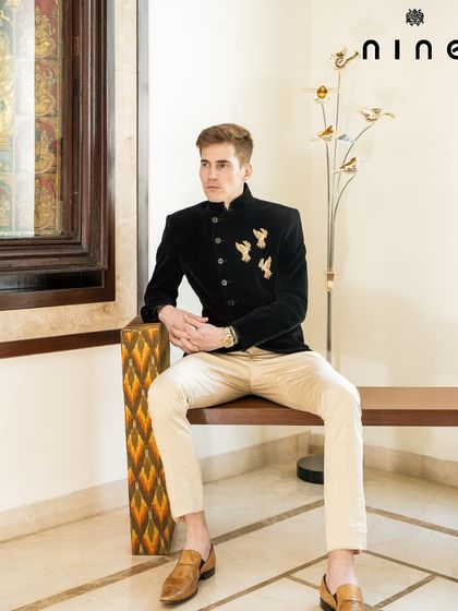 We make custom western suits, tuxedos, and jackets using lightweight imported fabrics for Indian weather, with options for hand-embroidered Indian details.