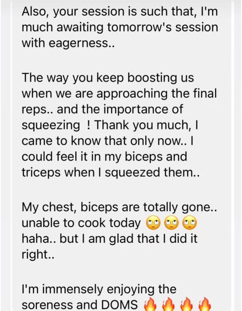 Nothing speaks louder than the success and happiness of my clients. These messages are a testament to the transformations we achieve together, focusing on consistency, proper technique, and finding joy in the journey.