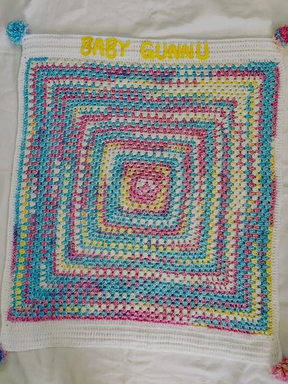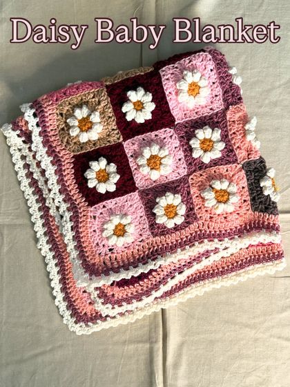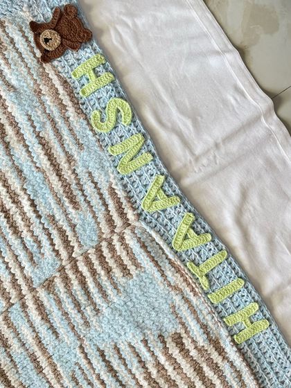 I hand-crochet baby blankets to your size and design, add names or appliqués if you want, and each piece is made by me and my daughter, not from a factory.
