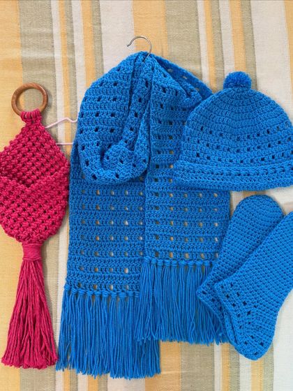 We create a range of handcrafted accessories, from stylish macrame sling bags to cozy crochet winter sets. This collection also includes smaller items like keychains and earrings, perfect for gifting or adding a personal touch to your look. Every item can be made to order.