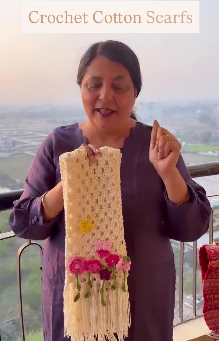 Discover my collection of handmade crochet scarves, available in both pure cotton for summer and warm wool for winter. Each piece is fully customizable, from the base color to the floral designs, making it a truly personal accessory.