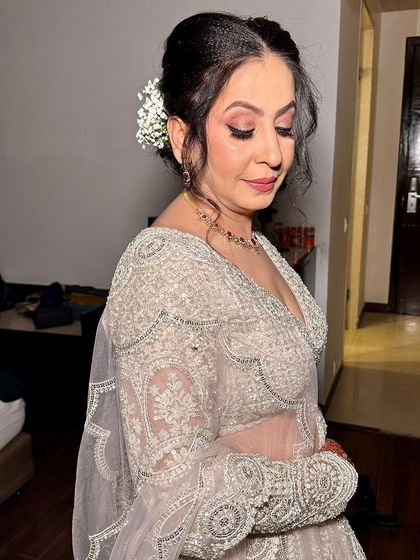 Brides and family members seeking elegant, event-appropriate makeup for pre-wedding functions who want to look radiant while maintaining their natural beauty.