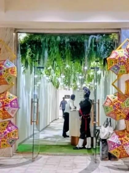 - Religious and festive moments - For pujas, we use loads of genda phool (marigold flowers) and vibrant drapes. For festivals like Navratri, expect umbrellas and Garba dancer cutouts that bring the mood alive - traditional festival lobby design is our thing.