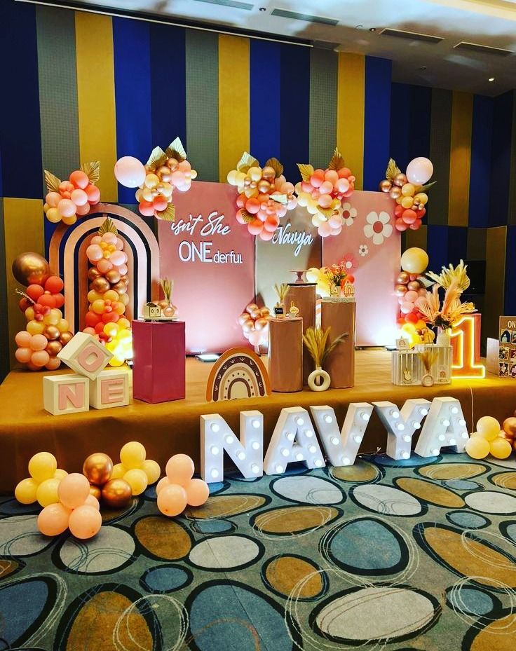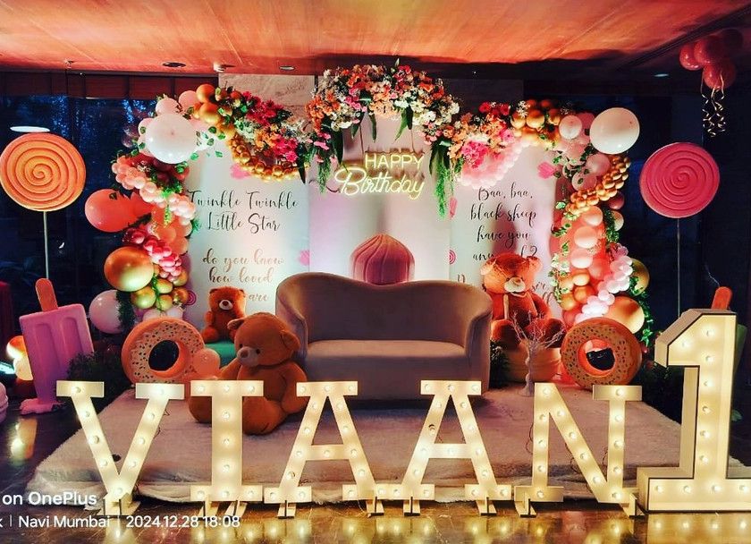 We create memorable birthday celebrations for all ages, from a child's first birthday to a 60th or 80th milestone. Our services include custom themes like Jungle or Candyland, complete with balloon arches, themed backdrops, and large marquee lights for names and ages.