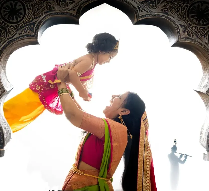 I create timeless portraits of your little one as Krishna or Radha, complete with authentic costumes and divine backdrops. These sessions capture the playful spirit of Kanha and the graceful charm of Radha, often including beautiful mother-child moments as Yashoda and Krishna.