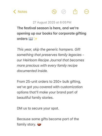 Go beyond the usual gift hampers with a meaningful heirloom that lasts for generations. We offer custom, silk-bound recipe journals for corporate orders starting at 25 units, perfect for Diwali, employee appreciation, or client gifting. We can incorporate your company logo and a personalized message, making your brand a part of your team's family story.