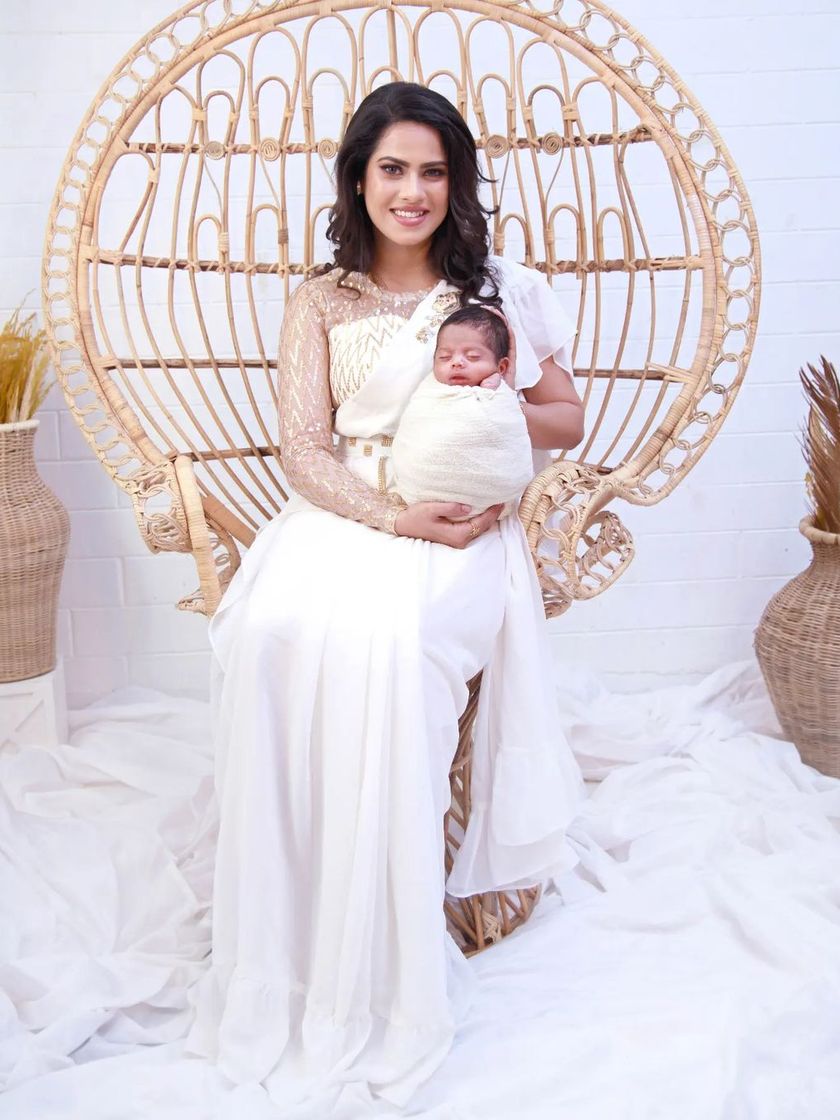 For those looking for something different from a gown, I offer specialty sarees designed for photoshoots. These pieces provide a modern yet traditional look, perfect for maternity or newborn sessions. My collection includes unique designs like this white frill saree with custom Aari embroidery, adding a personal touch to your pictures.