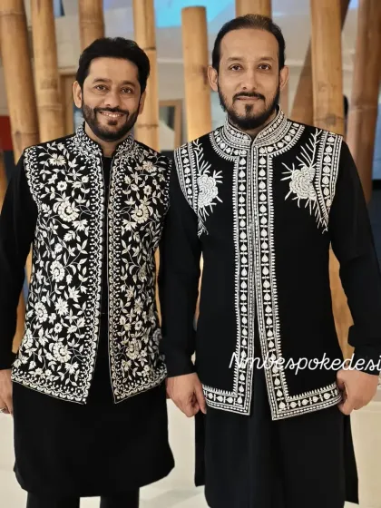 A custom waistcoat, or Bundi jacket, is the perfect layering piece to elevate a simple kurta set. I design them in a range of fabrics like velvet and silk, with options for intricate zari, floral, mirror, or threadwork embroidery to match your style.