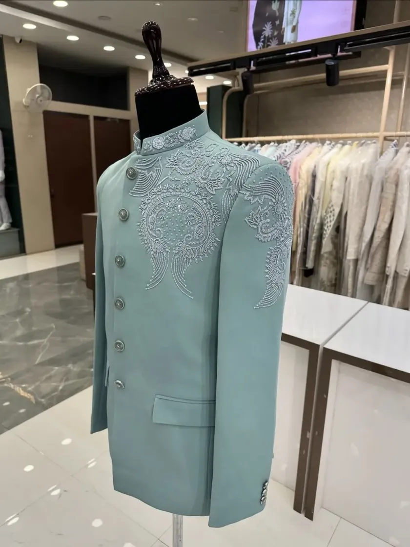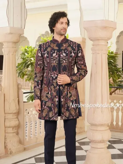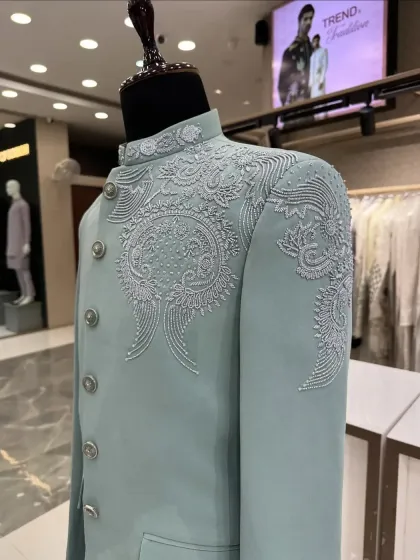 Explore my collection of royal Jodhpuri and Bandhgala suits, the epitome of Indian regal elegance. I craft these suits with precision tailoring and offer customization in fabrics, colors, and embroidery, making them perfect for sangeets, receptions, and formal celebrations.