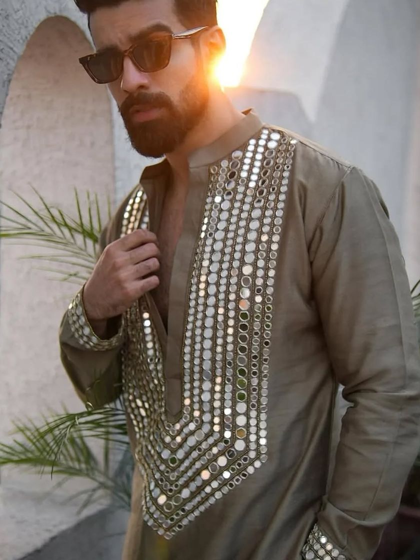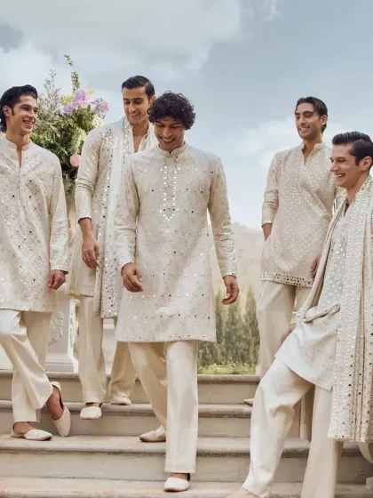 I specialize in creating cohesive looks for the entire wedding party. Whether you want matching sherwanis for the groomsmen or coordinated kurta sets in a specific color palette, I can design and craft outfits for your whole team.