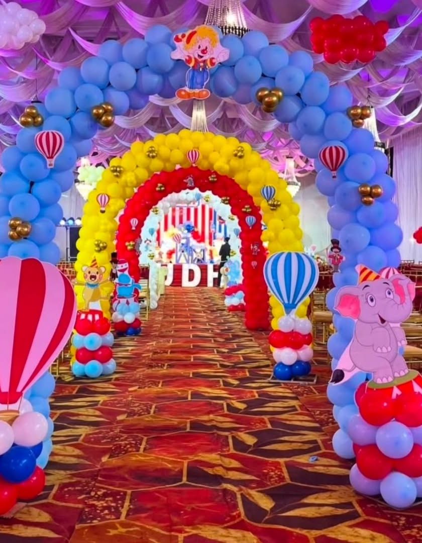 We create immersive worlds for your child's party with large-scale, themed decorations. This includes everything from spectacular entrance arches for a carnival theme to detailed backdrops that make for perfect photo opportunities.