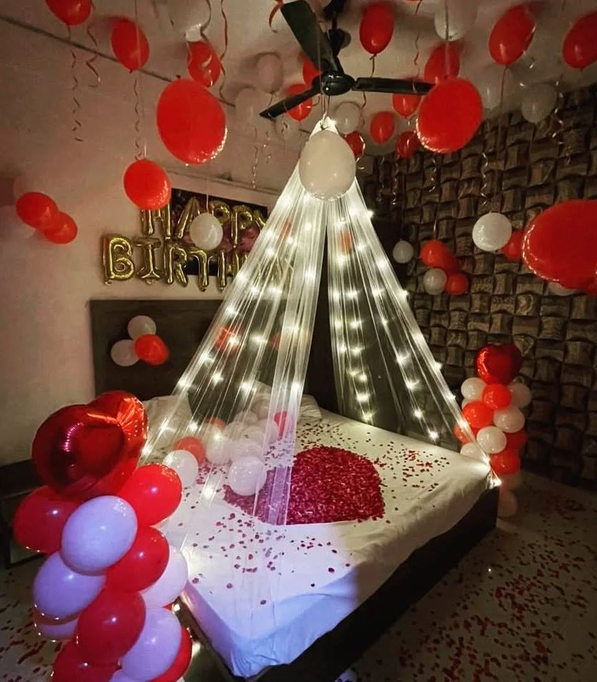 I can turn any room into a romantic haven for your special occasion, be it a birthday, anniversary, or a surprise proposal. These setups often include elements like fairy light canopies, ceilings filled with balloons, and custom messages written with flower petals.