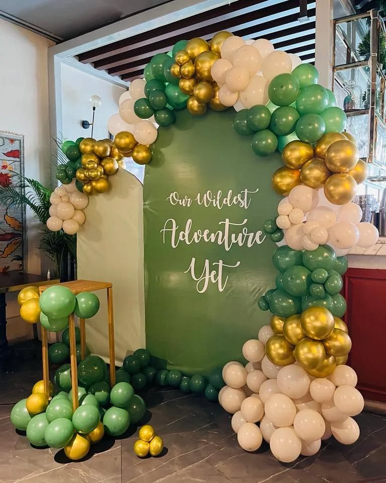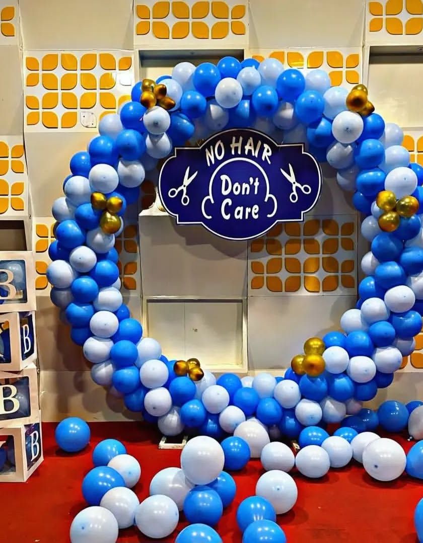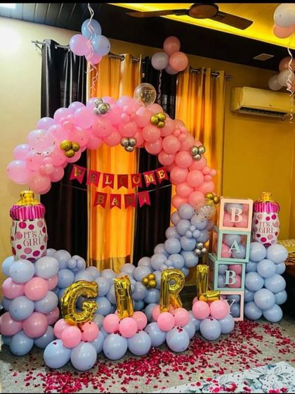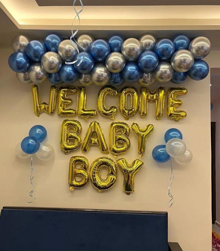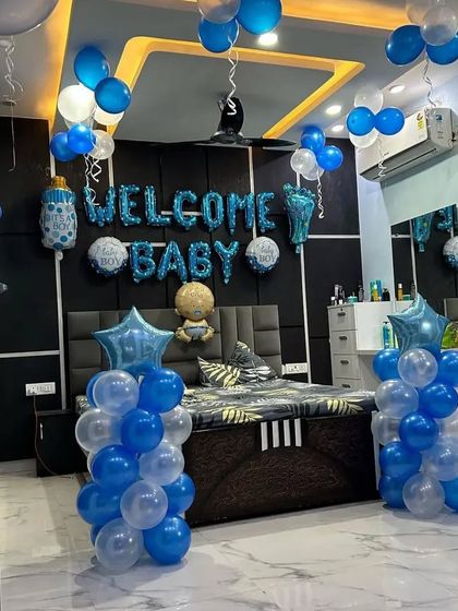 I offer a range of decorations to celebrate the arrival of your baby boy. These setups typically use blue, silver, and white balloons, custom backdrops, and foil balloons spelling "Welcome Baby Boy" or your baby's name.