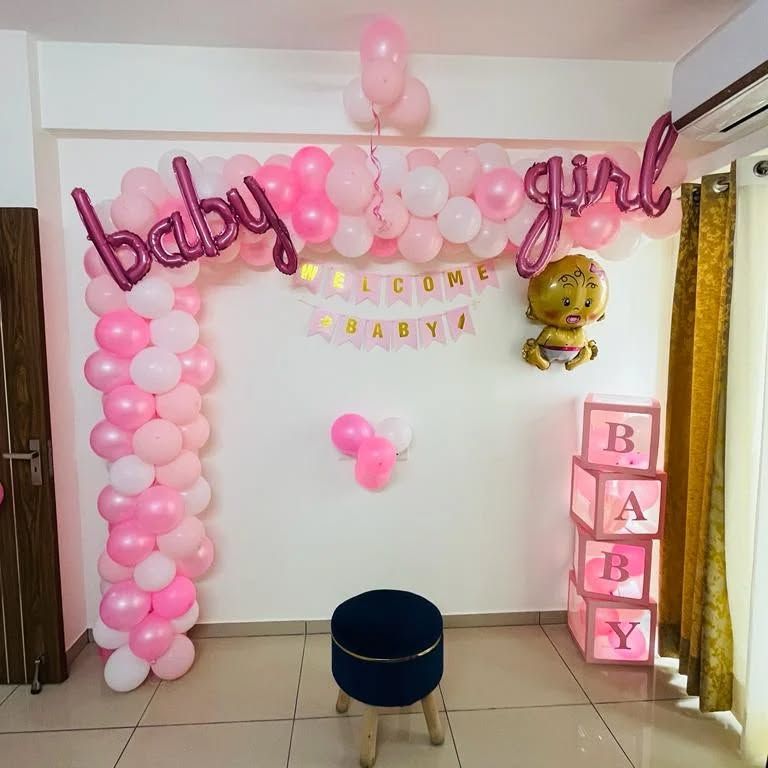 I design beautiful and personalized decorations to welcome your little princess. These setups often include pink, purple, and gold color schemes, "Welcome Princess" or custom name foil balloons, and can be arranged in your living room or bedroom.
