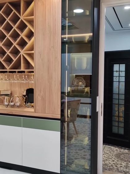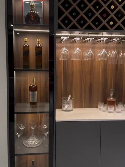 We create custom bar and crockery storage designed for entertaining and display. These units feature practical elements like diamond-pattern wine racks and stemware holders, combined with elegant glass-door cabinets and integrated lighting to showcase your collection.