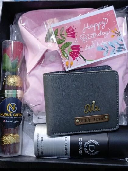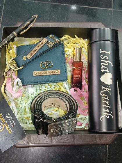 I make custom gift hampers for men with engraved accessories, branded shirts, and personal touches, packed by hand for each occasion.
