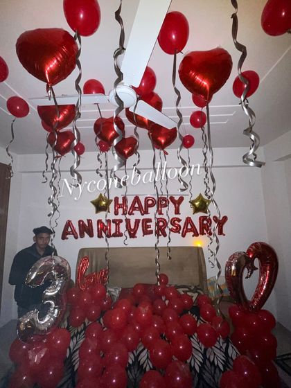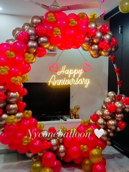 - Anniversary balloon decor with big numbers, 'HAPPY ANNIVERSARY' letters, and your choice of colors. Red and silver is a classic, but I can do modern looks too, like ring backdrops and neon signs for those Insta-worthy photos.
