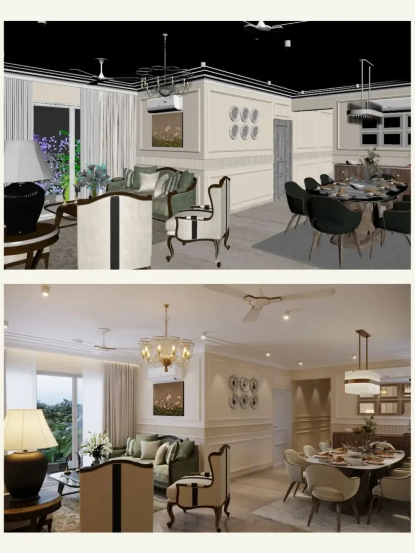 We design living and dining areas that serve as the heart of the home, balancing social gatherings with quiet relaxation. Our approach involves creating a harmonious flow with custom furniture, curated lighting, and a thoughtful mix of textures, from warm and neutral lounges to opulent and classic drawing rooms.