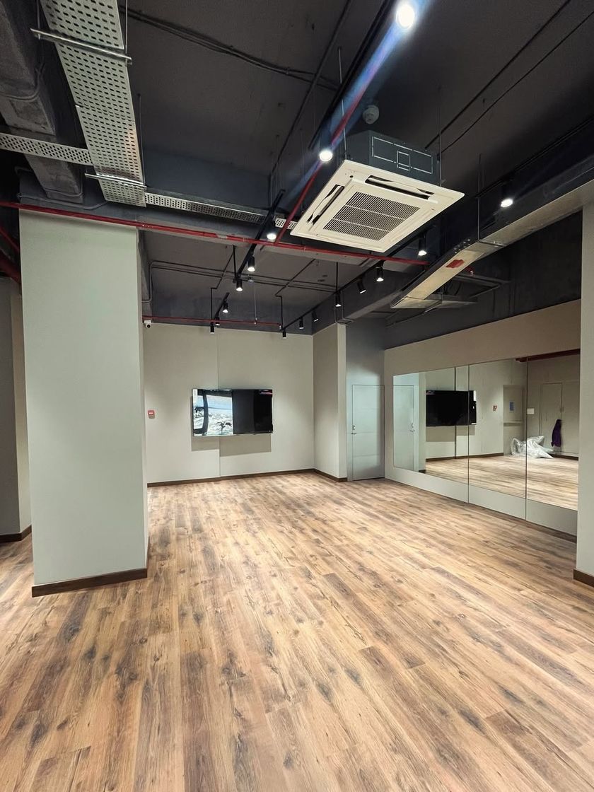 Here’s a detailed look at the studio's key elements. I designed the space with smooth wooden flooring, full-length mirrors for form checks, and an industrial ceiling with adjustable track lighting to create the perfect mood for any session.