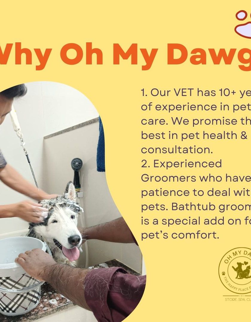 I designed Oh My Dawg to be a happy place for pets. Take a look at our unique grooming station and see some moments from our community events, including our adoption drives.