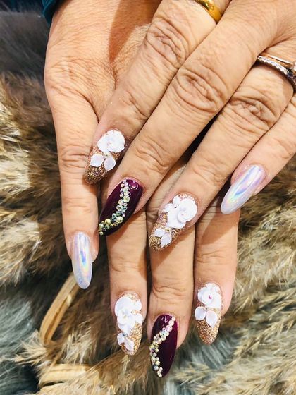 I do custom nail art, gel and acrylic extensions, nail care, and offer home service for all styles from classic to 3D designs.