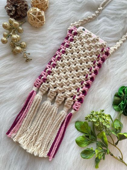 I create handmade pouches to keep your most important items safe and stylish. This includes custom-sized macrame laptop bags with unique color stripes and handy phone pouches that are perfect for quick errands or gifting.
